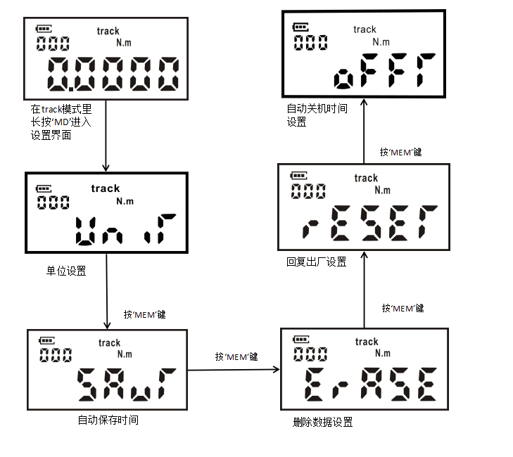 1、按MEN進行切換,按MD鍵退出設置模式回到Track模式,UNIT 單位設置按上下鍵切換