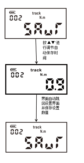 2、SAUT 峰值模式下自動保存數據時間設置,當設置為0時為手動保存(按MEM鍵保存),按上下鍵進行時間設置時間MAX為4秒,保存數據可保存100組。