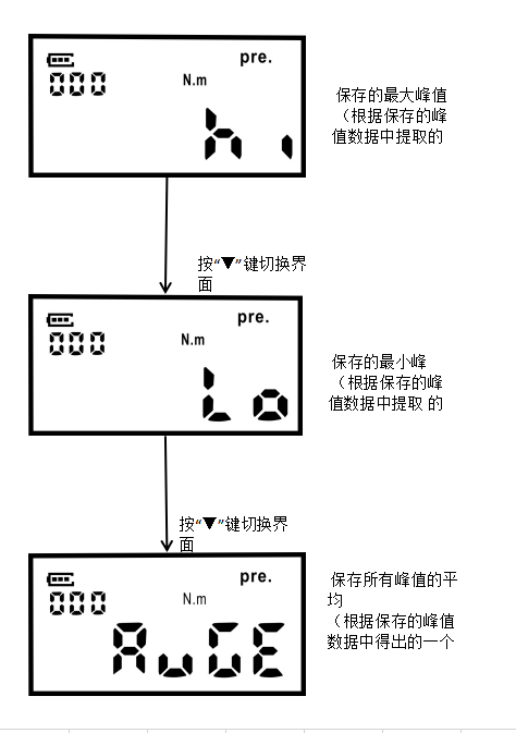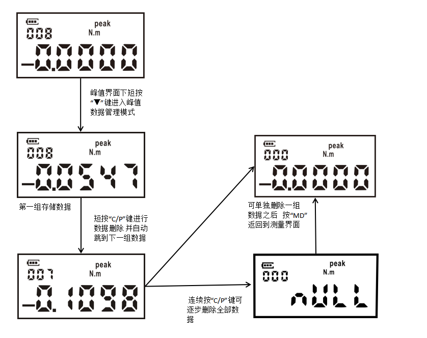 ⑥ 在PEAK(峰值)模式下按向下鍵,進入峰值數據查看界面,用向下或向上鍵可以查看每一組數據。P/C鍵可以刪除當前數據。MD鍵返回peak模式。
