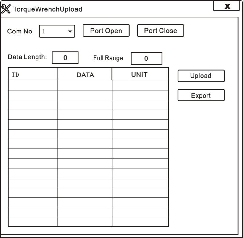 使用制造商提供的光盤,在電腦上安裝好通訊軟件,然后在數顯扭矩表開機狀態下用數據線連接數顯扭矩表和電腦,雙擊軟件圖標,打開軟件,先選擇“Com No(端口號)”,再點擊“Port Open”,然后點擊“Upload”,這時表格上會出現本儀器內的存儲數據,表示上位機已連接成功,已達到讀取存儲數據的目的。