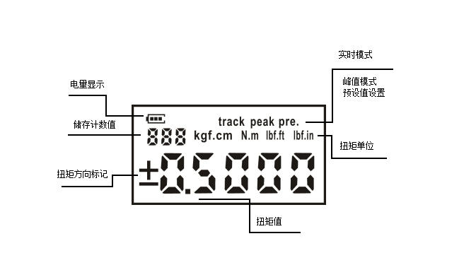 4位半LCD液晶顯示器包含電量顯示、兩種工作模式、預置值設置、扭矩單位、扭矩值、扭矩方向標記、存儲計數值。