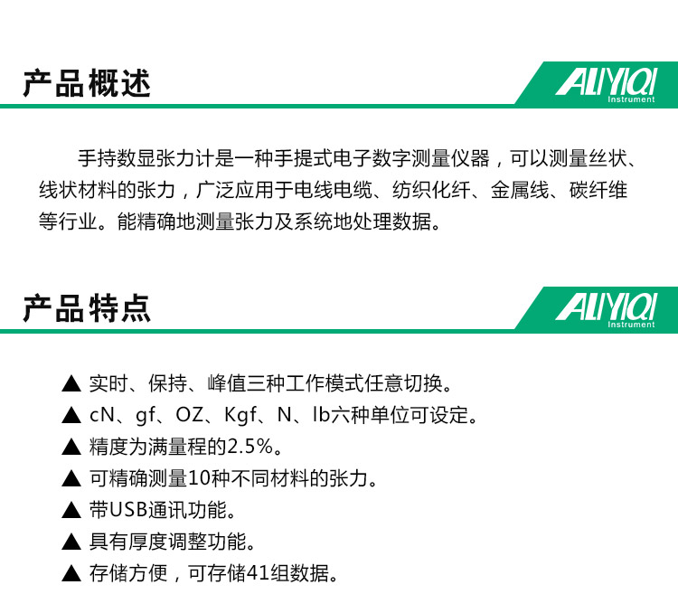 手持式張力計新產品上新啦 Publish Time: 11/06 2018 Author: Site Editor Visit: 1336 手持數顯張力計是一種手提式電子數字測量儀器,可以測量絲狀、線狀材料的張力,廣泛應用于電線電纜、紡織化纖、金屬線、碳纖維等行業。能精確地測量張力及系統地處理數據。