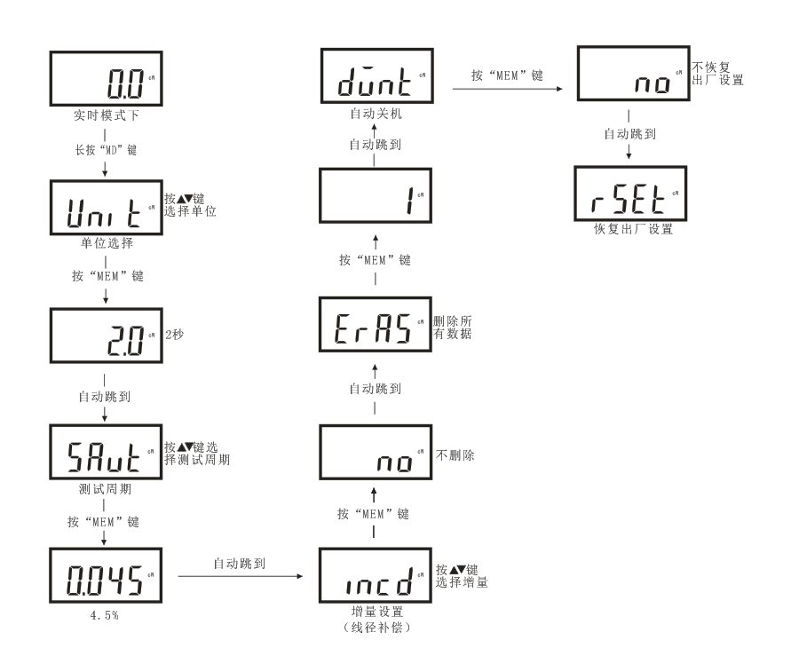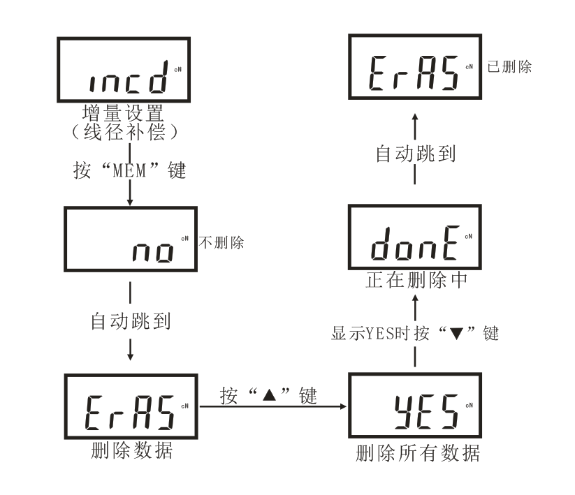 刪除儀器內存儲的所有數據。 “YES”為全部刪除,顯示“YES”時按“”鍵選擇確認刪除數據。按“MD”直接退出不刪除數據。如下圖所示: