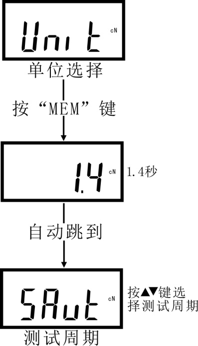單位為秒,針對“HOLD”模式。例如選擇“1.4”秒,在“HOLD”模式下施加力時,儀器顯示屏每過1.4秒會閃現一組數據并自動保存,且每一組數據里面都含有最大值、最小值、平均值。