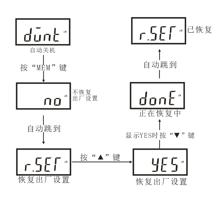 恢復出廠設置,按“”鍵選擇恢復出廠設置,顯示“YES”時按“ ”鍵確認恢復出廠設置。如下圖所示: