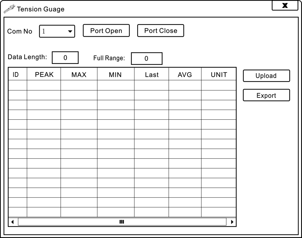 使用制造商提供的光盤,在電腦上安裝好通訊軟件,然后在手持數顯張力計開機狀態下用數據線連接手持數顯張力計和電腦,雙擊軟件圖標,打開軟件,先選擇“Com No(端口號)”,再點擊“Port Open”,然后點擊“Upload”,這時表格上會出現本儀器內的存儲數據,表示上位機已連接成功,已達到讀取存儲數據的目的。